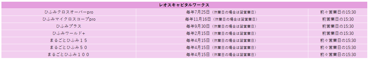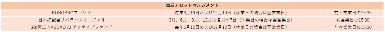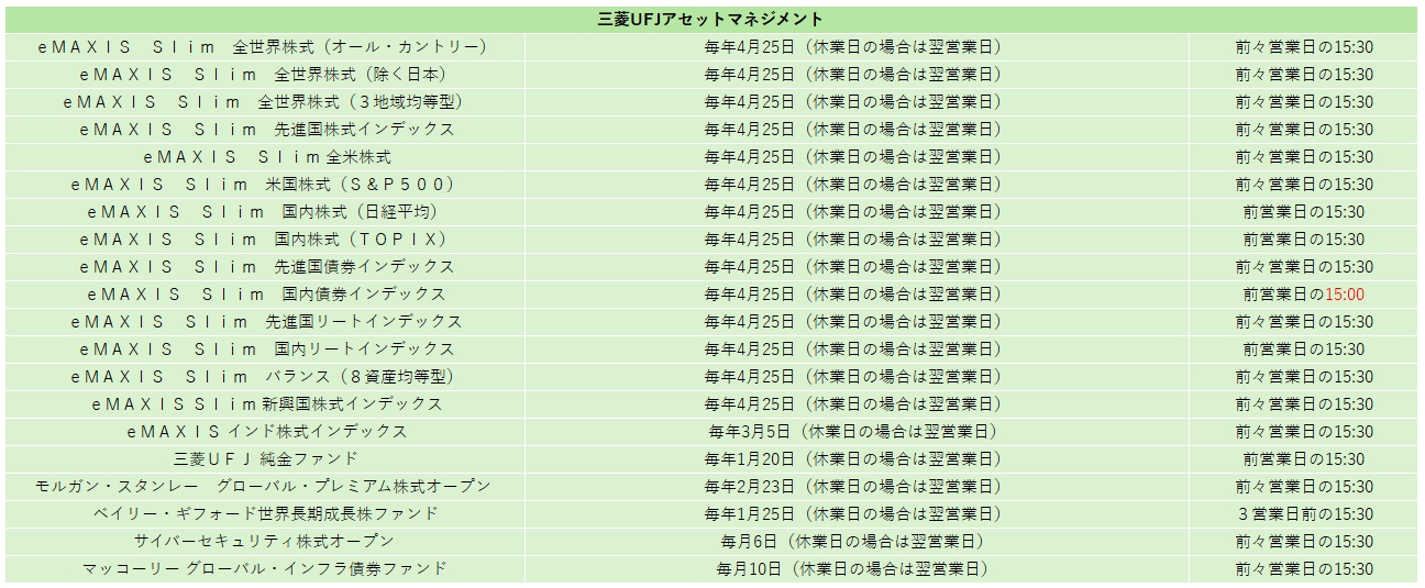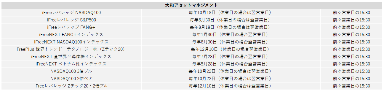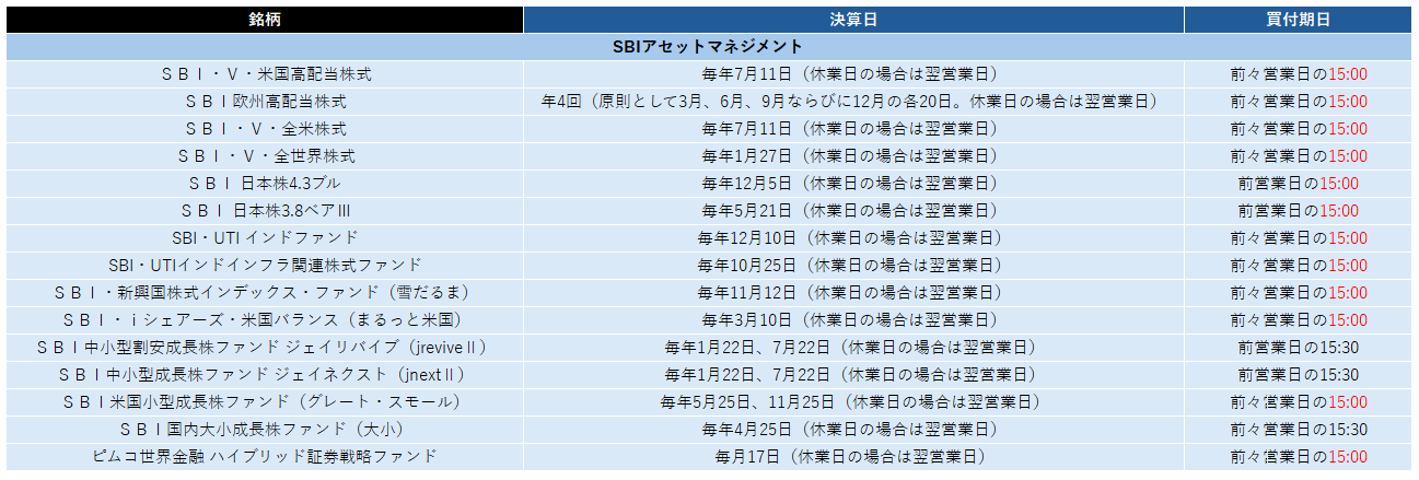 銘柄ごとの決算日及び買付期日は下表をご参照ください。