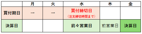 「翌営業日の基準価額」が適用される投資信託は、決算日の前々営業日の注文締切時間までに買付いただく必要がございます。