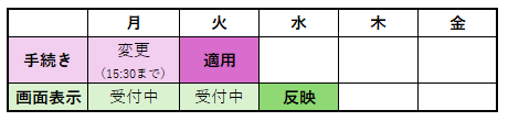 営業日の15:30までにお手続きをいただいた場合、原則翌営業日から変更は適用され ますが、変更受付ステータスは変更入力当日と翌営業日の間は原則「受付中」となり、2営業日後に受付結果が表示されます。
