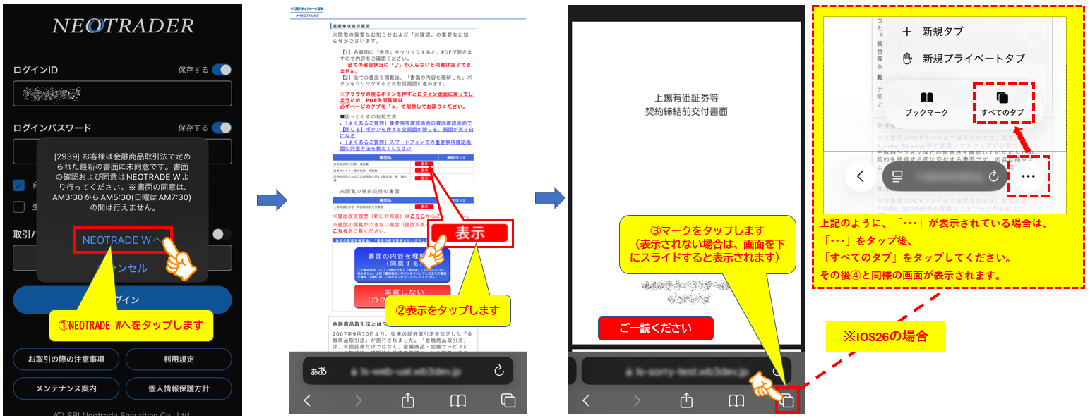 ※書面表示後、③左下の戻るボタンおよびスワイプ操作にて確認画面に戻りますと、
