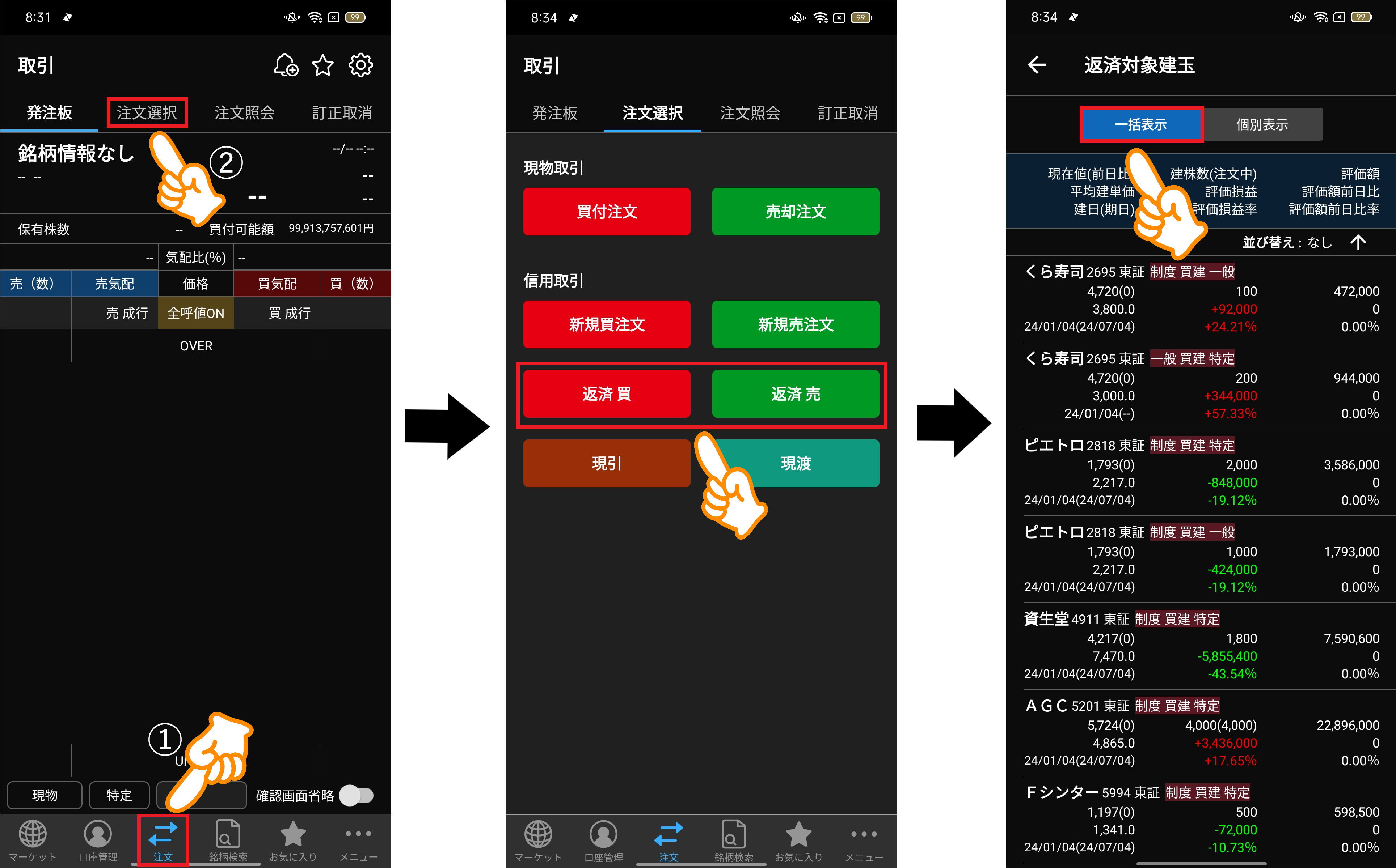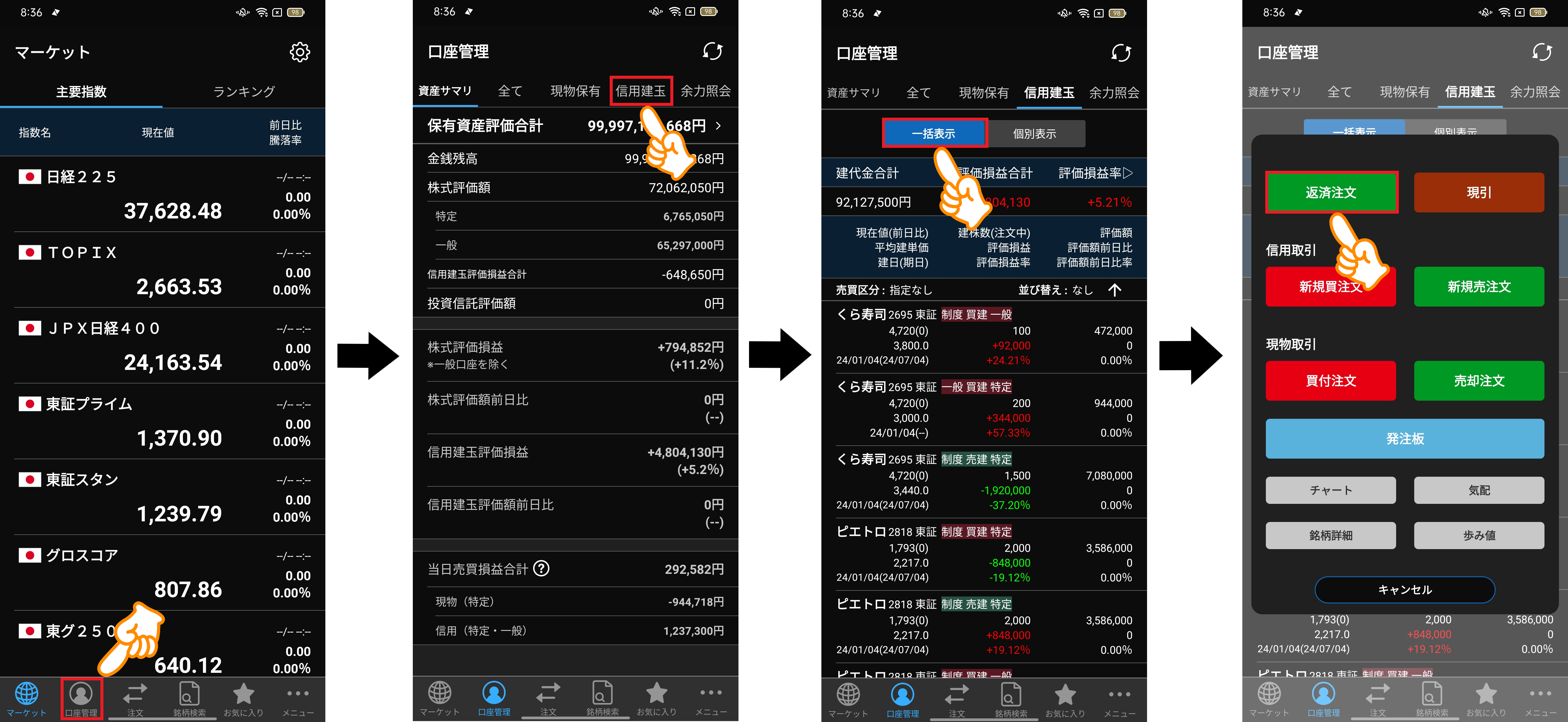 口座管理→信用建玉→画面上部「一括表示」を選択→返済希望の銘柄をタップ→返済注文をタップ